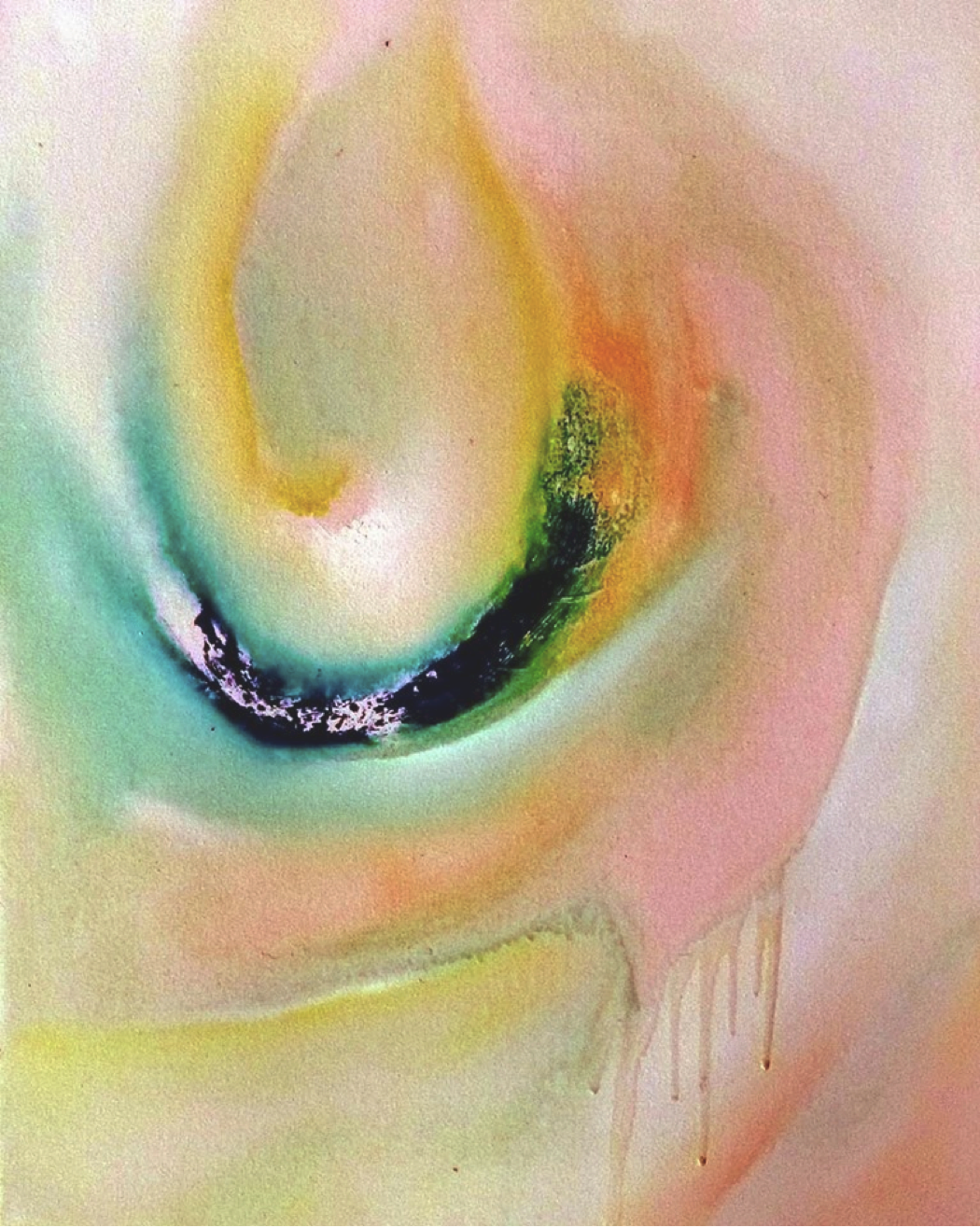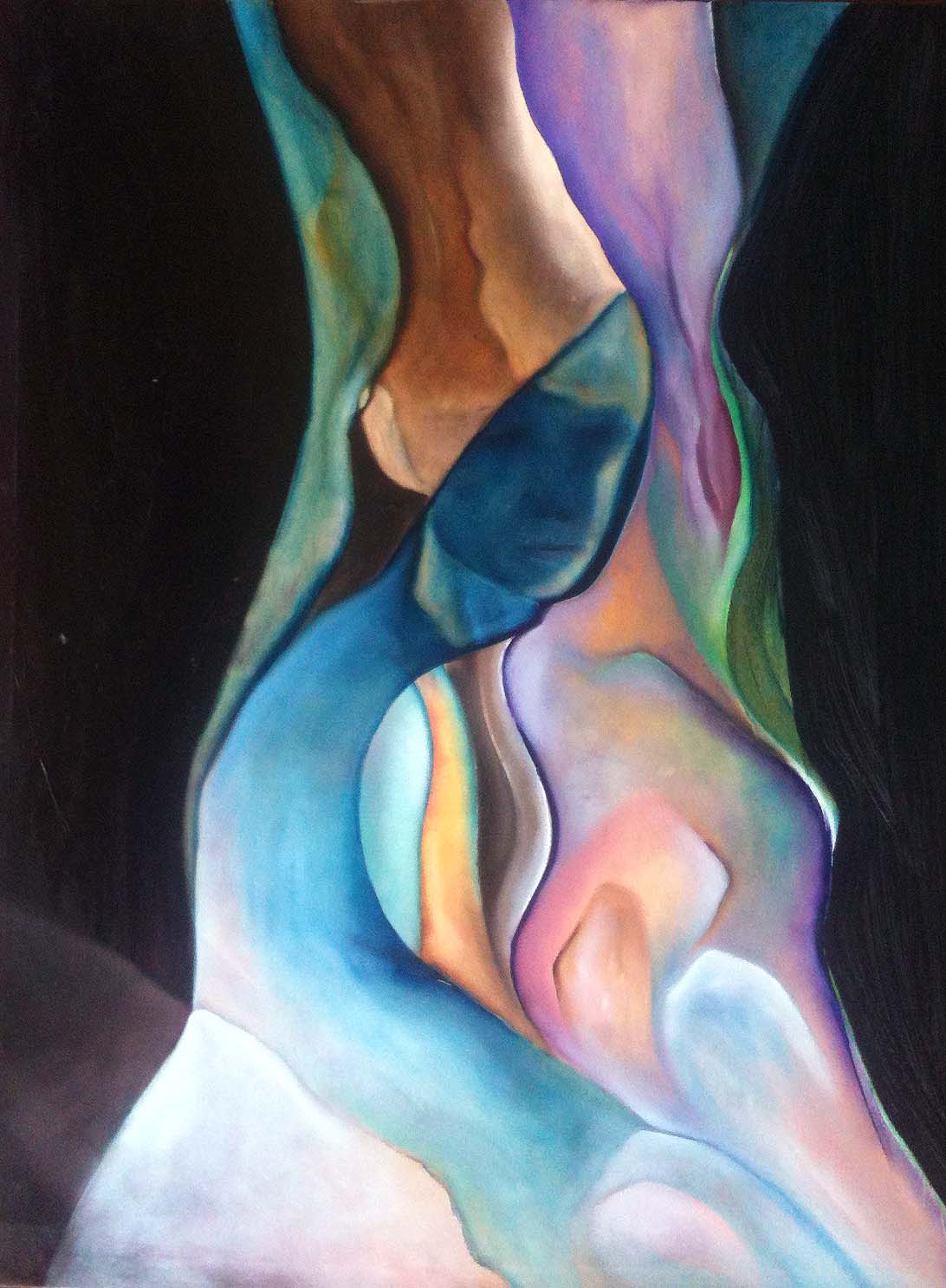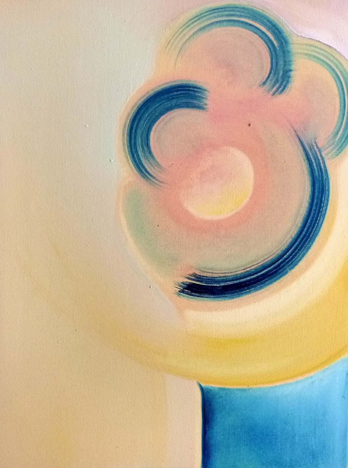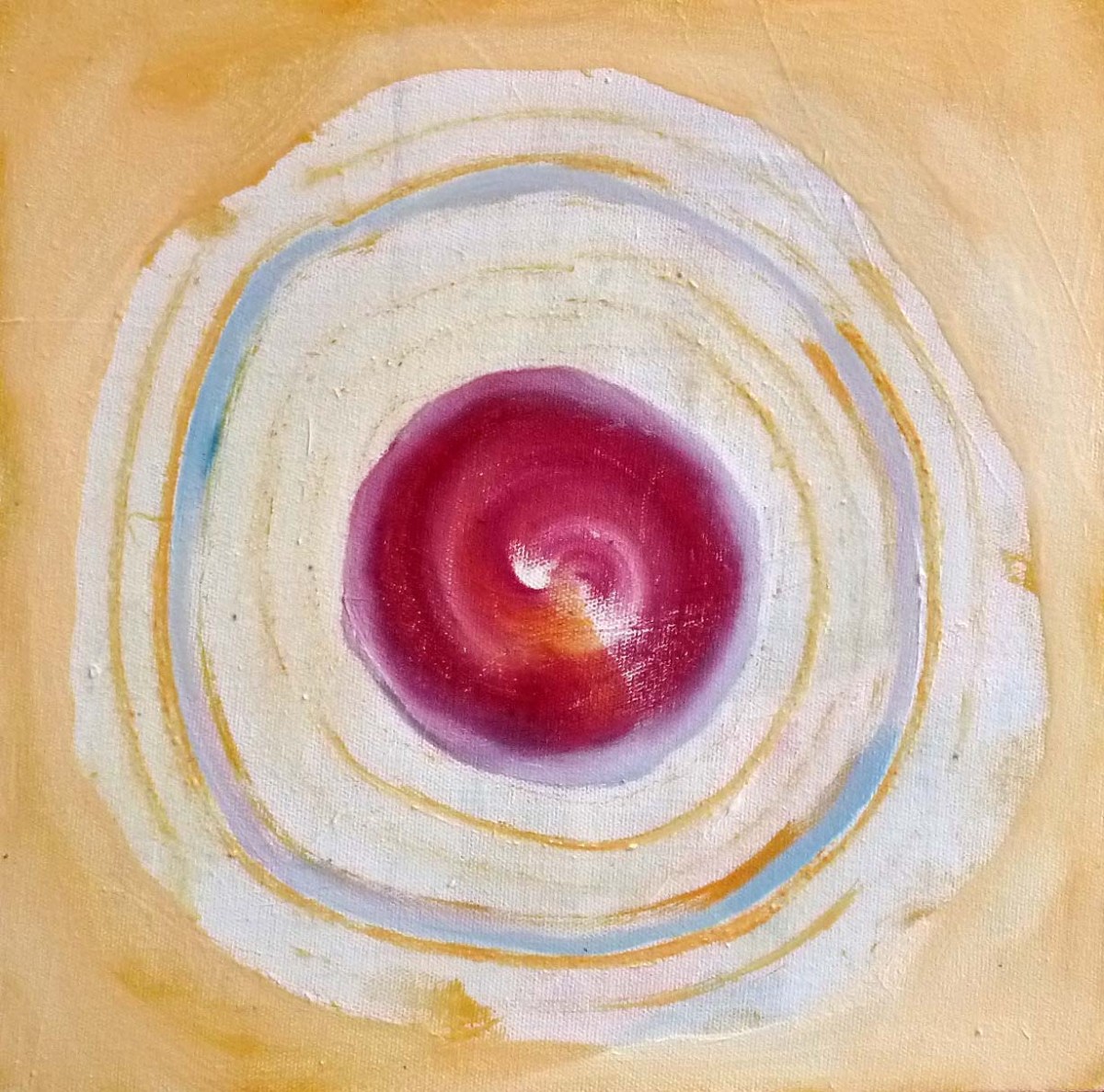 My paintings are not arranged by timeline or series. I paint what inspires or what needs to be expressed by me in the moment. I feel that in allowing this spontaneity, greater themes or patterns reveal themselves in remarkable ways that reveal an unfolding that occurs not in linear time, but in spiral time — a revisitation of colours, forms and moods that expand and contract, zoom in and zoom out, shifting continually. Like puzzle pieces, I can shift the order of the paintings to create juxtapositions and dialogues that awaken new insights and recognitions. In this way, they are a moving mythology of my inner world.